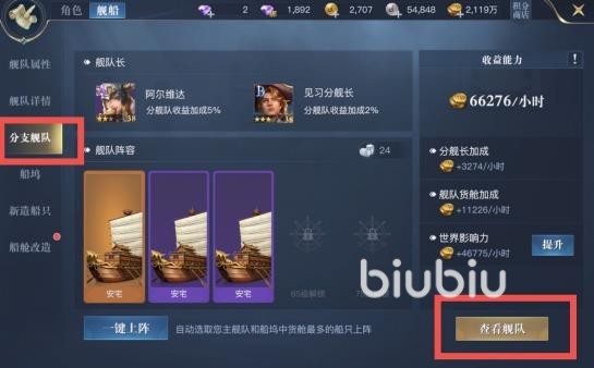 首先我們可以通過分支艦隊(duì)來獲得,玩家可以在游戲界面中的右下角進(jìn)入【船只】界面,選擇【分支艦隊(duì)】的選項(xiàng),然后在界面右下角【查看艦隊(duì)】處查看并且領(lǐng)取分艦隊(duì)的收益。