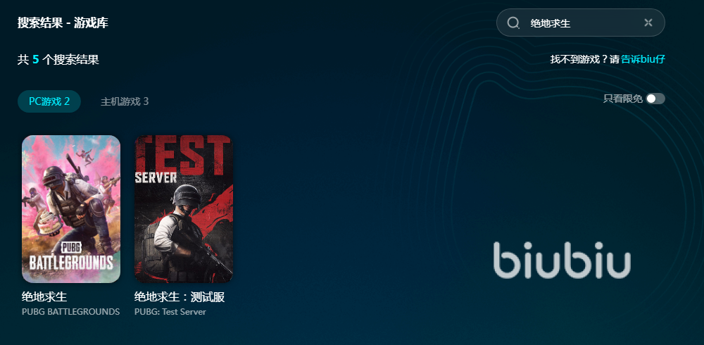 biubiu軟件就是實惠好用加速器的典范,每個月只要花很少的錢就能使用,大學(xué)生最低每天只要0.3元。而新用戶注冊后還能立即獲得24小時免費體驗,限免體驗也可以加速全平臺游戲,找到絕地求生以后就能馬上加速了。