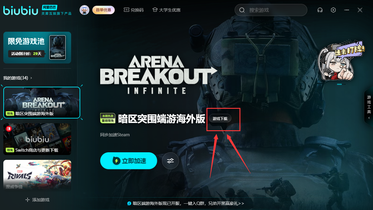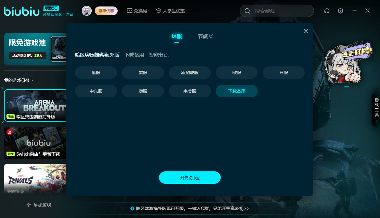 biubiu是一款高效且易用的加速工具,它不僅可以幫助玩家流暢地游玩海外游戲,還可以提供快速的下載服務(wù)。想要下載《暗區(qū)突圍無限》的玩家,只需按照以下幾個簡單步驟操作即可:
