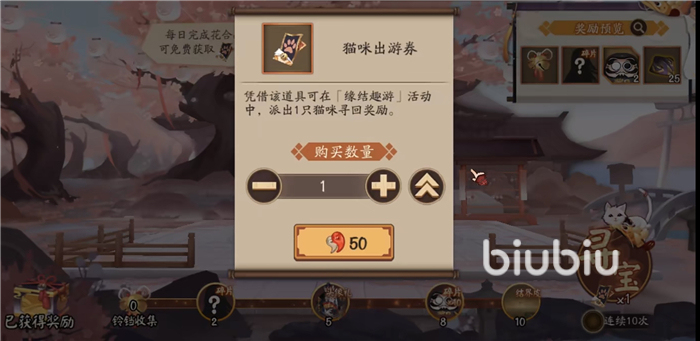目前,根據(jù)游戲規(guī)則,玩家每天可以在雜貨鋪以及活動(dòng)界面拿五十勾玉兌換貓咪出游券,另外每天完成花合戰(zhàn)活躍任務(wù)也能夠獲得券。