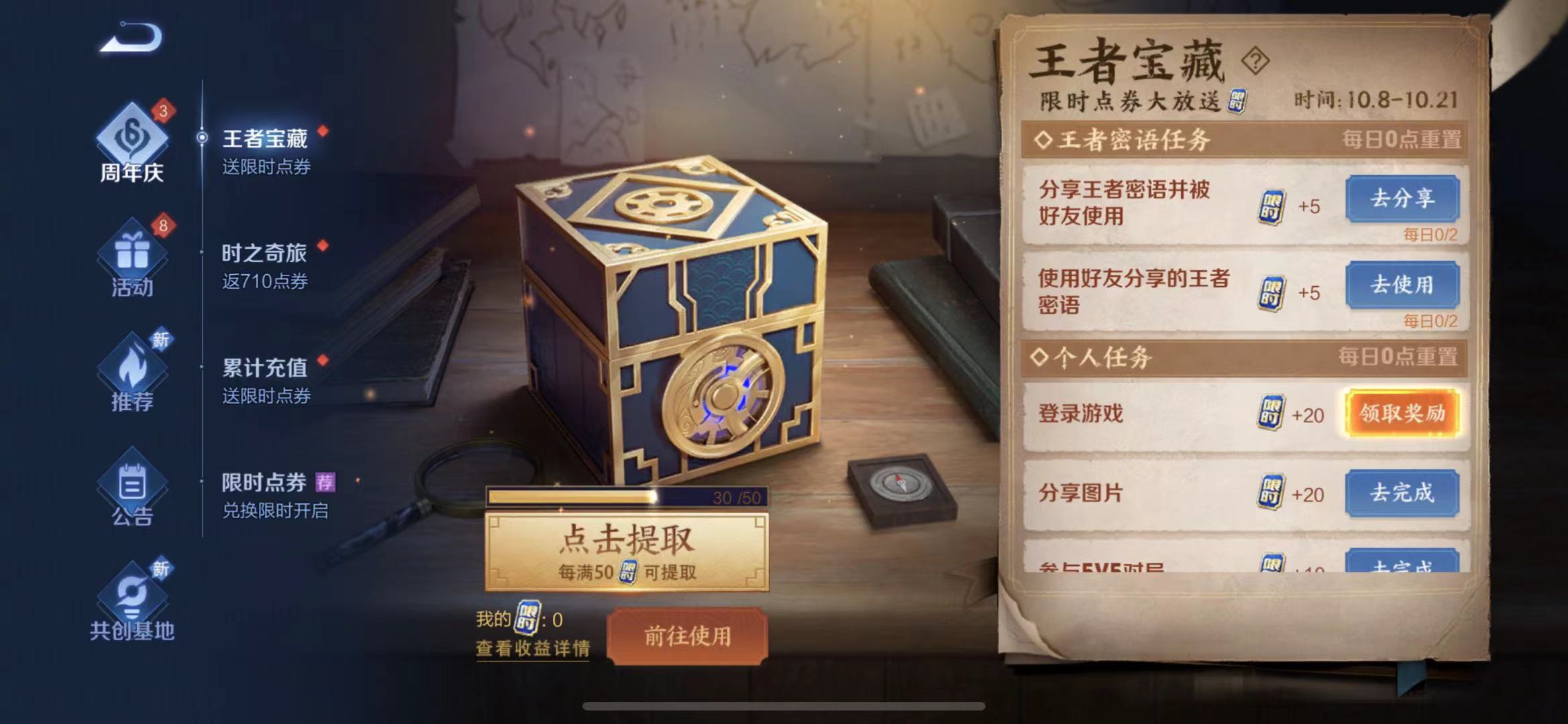 密語(yǔ)活動(dòng)的名字叫做王者寶藏,打開(kāi)游戲活動(dòng)頁(yè)面后即可找到。玩家們可以通過(guò)做各式各樣的任務(wù),從而獲取限時(shí)點(diǎn)券,當(dāng)限時(shí)點(diǎn)券達(dá)到50點(diǎn)以上的時(shí)候即可提取。提取之后便可以在制定的限時(shí)點(diǎn)券商店里面,兌換自己想要的皮膚或者英雄,最高可獲得一千點(diǎn)點(diǎn)券,不過(guò)的點(diǎn)券可以通過(guò)充值彌補(bǔ)。