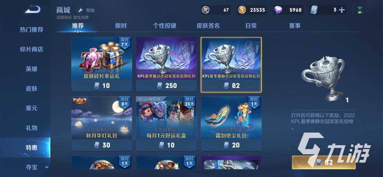 來源: 極光 作者: 懶卿 2022年09月14日 11:40王者榮耀在游戲中隨著春季總決賽的開展,也相應(yīng)的開展了相關(guān)的活動(dòng),其中就有需要道具才能兌換的物品,下面就準(zhǔn)確講講王者榮耀冠軍簽名信物有什么用。其實(shí)在活動(dòng)中信物就是兌換貨幣,不過這些活動(dòng)都不是同一時(shí)間進(jìn)行的,所以玩家在拿到信物的時(shí)候不要盲目使用,一起瀏覽下面介紹的內(nèi)容了解一下吧!