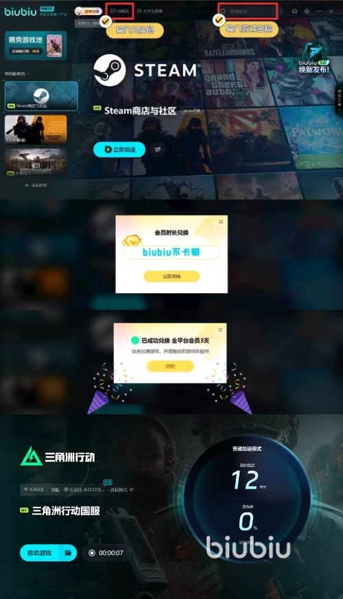 biubiu軟件福利超多,新用戶能免費(fèi)體驗(yàn)一段時(shí)間,第一次登錄自動(dòng)領(lǐng)取一天免費(fèi)時(shí)長,隨意為游戲庫中任意一款游戲加速,開啟歡樂冒險(xiǎn)之旅。接下來,大家通過兌換碼,還能獲得三天免費(fèi)體驗(yàn)時(shí)長。玩家使用biubiu不卡頓就能兌換。兌換碼具體使用方法是在biubiu軟件搜索框輸入關(guān)鍵詞。
