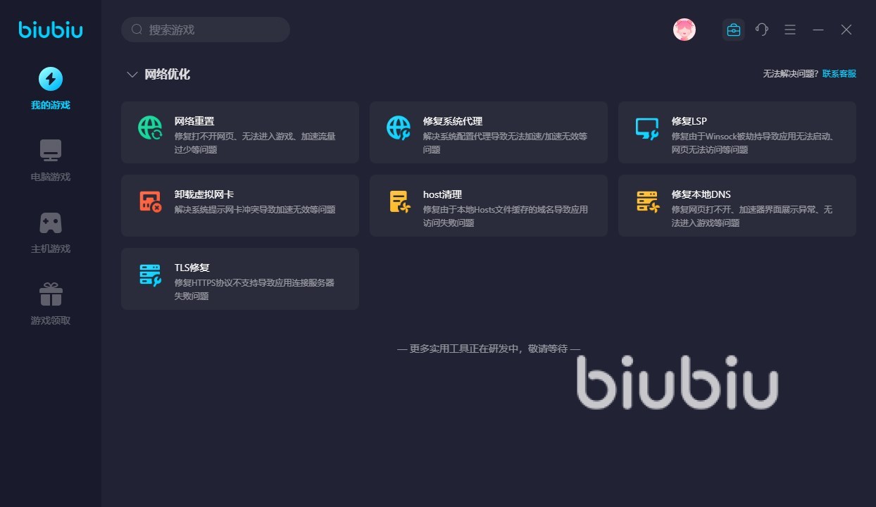 大家玩游戲經(jīng)常擔(dān)心的遇到網(wǎng)絡(luò)問題,有時候完全沒弄明白問題出在哪里,這是就可以用到biubiu加速器自帶的網(wǎng)絡(luò)優(yōu)化工具了,從用戶頭像右側(cè)的“工具箱”圖標(biāo)即可進(jìn)入,這里羅列了一系列的網(wǎng)絡(luò)修復(fù)工具,大家可以逐個嘗試來排查網(wǎng)絡(luò)問題。