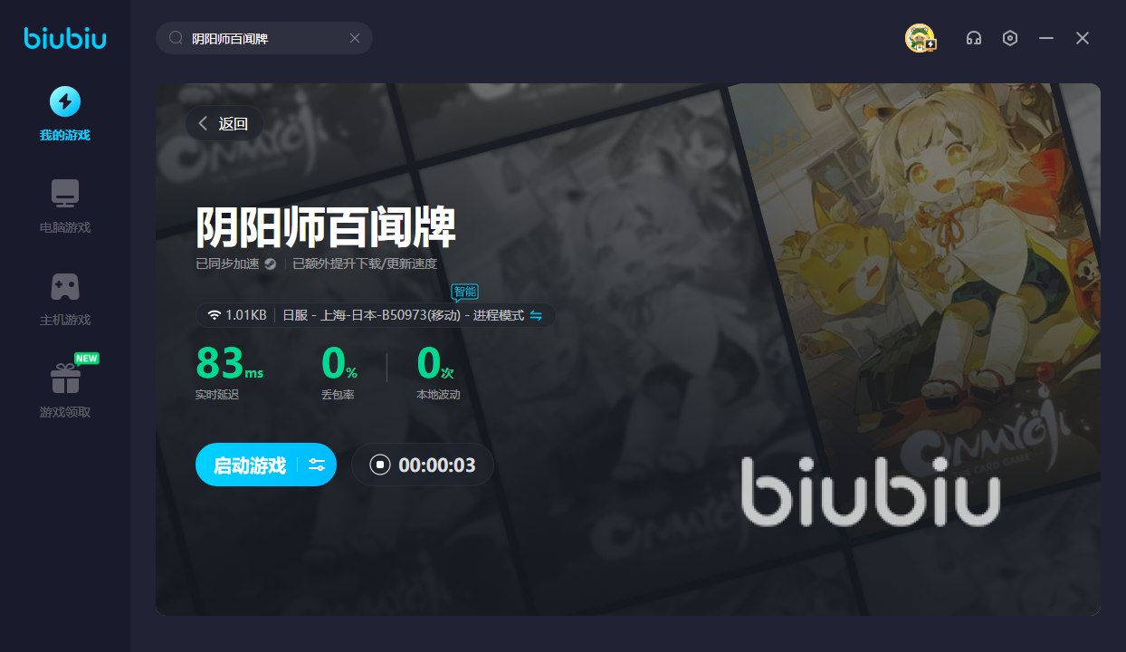 陰陽師百聞牌目前僅有日服,所以為了混入和風滿滿的游戲中。大家就得使用biubiu,便可在優(yōu)質(zhì)網(wǎng)絡的帶領(lǐng)下,隨心所欲地進入陰陽師的世界中開啟戰(zhàn)斗!想要試玩一下的話,新用戶可領(lǐng)取24H的免費加速。另外新老用戶均可使用【biubiu不卡頓】,便可獲取三天免費加速,這樣即可繼續(xù)加速得更加過癮。若是打牌的途中太卡的話,很容易導致回合結(jié)束,讓你錯失一手好牌。有了加速器后,才能防止卡頓,讓你每次都能如約出牌!