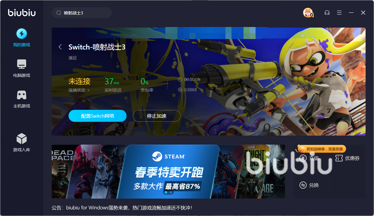 然而這次的噴射戰(zhàn)士新作卻有一點(diǎn)為人詬病,那就是服務(wù)器質(zhì)量太差了,掉線斷聯(lián)非常頻繁,惹得諸位玩家非常不爽。目前市面上不少加速器都不支持三大主機(jī)平臺(tái)游戲的加速,又或者是加速質(zhì)量差,但是小編經(jīng)過測試后發(fā)現(xiàn)biubiu加速器的質(zhì)量非常游戲,ping值保持穩(wěn)定,掉包率處在0,小編測試幾局后,沒有出現(xiàn)掉線的情況,而且ns的net類型穩(wěn)定在open狀態(tài)。