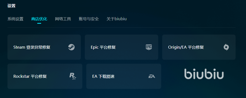 很多愛玩steam的小伙伴對biubiu是贊不絕口,因為它可以加速steam商店,加速以后大家查找steam商店里的游戲就特別順暢特別方便。它還可以修復(fù)各大游戲平臺登錄異常和出現(xiàn)“意料之外的錯誤”等問題,在商店優(yōu)化當(dāng)中找到自己需要修復(fù)的平臺,點擊一下即可修復(fù)。