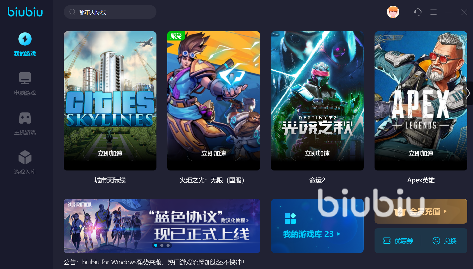 該軟件除了可以給pc游戲提供加速之外,還支持switch,xbox等平臺(tái)的游戲加速,直接在都說區(qū)域選擇對(duì)應(yīng)的版本就可以了。biubiu擁有豐富的游戲庫,相信大家不可能一直都只玩都市天際線這款游戲,時(shí)間久了也會(huì)出現(xiàn)疲勞期啊,可以去搜索其他游戲,新用戶首次登錄24小時(shí)免費(fèi)的會(huì)員,你可以隨便給你喜歡的游戲開啟加速模式,體驗(yàn)不錯(cuò)再考慮后期充值也不急。