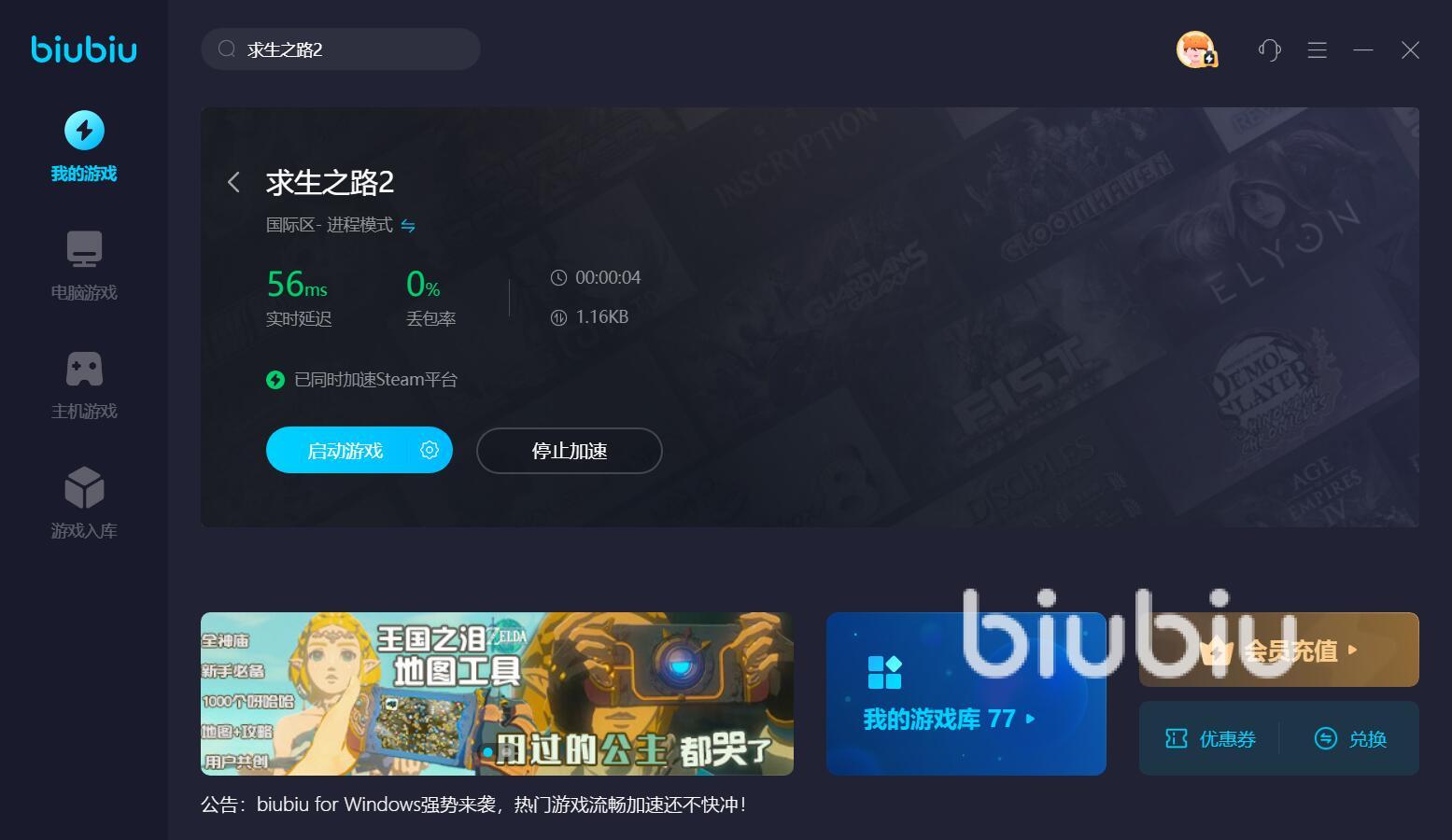游戲中復(fù)雜多樣的機(jī)制,以及較難的操作,都使該作品很難上手,即便是經(jīng)常混跡于游戲中的老手,也躲不開網(wǎng)絡(luò)的困擾,特別是用無線網(wǎng)去聯(lián)機(jī)游玩的用戶,如果網(wǎng)絡(luò)信號(hào)波動(dòng),不能穩(wěn)定地運(yùn)行,那么就會(huì)導(dǎo)致隊(duì)伍處于劣勢(shì),進(jìn)而輸?shù)魧?duì)局。而想要避免這種狀況發(fā)生,較為簡(jiǎn)單高效的措施,就是使用專業(yè)軟件,biubiu加速器就是一款不錯(cuò)的產(chǎn)品,其中的加速功能,支持各種熱門游戲的優(yōu)化,求生之路2也不例外,軟件內(nèi)有專門的加速入口,大家只需點(diǎn)一下圖標(biāo)上的立即加速,就能讓游戲流暢地運(yùn)行了。并且,現(xiàn)在安裝軟件的新人,還能享受新用戶注冊(cè)免費(fèi)使用加速24小時(shí)的福利。