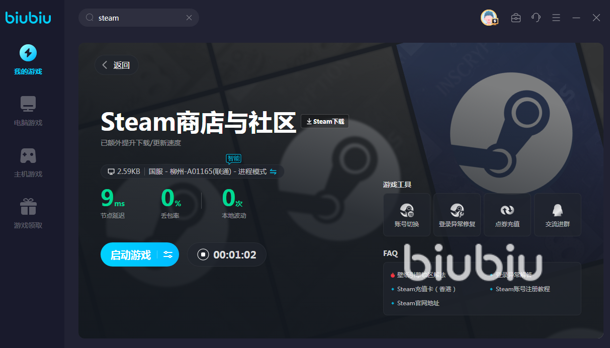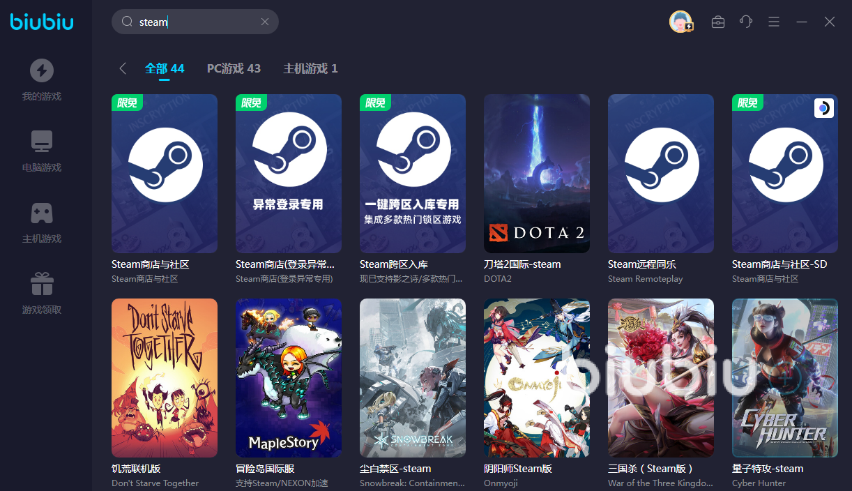 安裝好biubiu以后大家直接搜索steam,就能看到里面收錄的有關加速程序,可以加速商店與社區(qū)、支持遠程同樂、跨區(qū)入庫等等,還有一些steam版游戲在里面也能找到。平臺不斷更新資源,讓用戶享受到全面又優(yōu)質(zhì)的加速服務。
