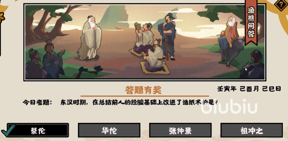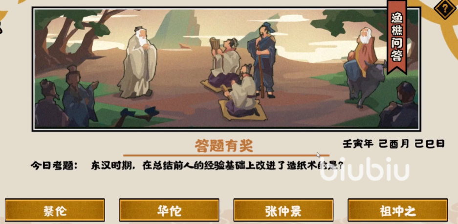 這次的漁樵問答題目是:在東漢的時候,是誰在結(jié)合了之前制造方法創(chuàng)造出了新的造紙術(shù)?