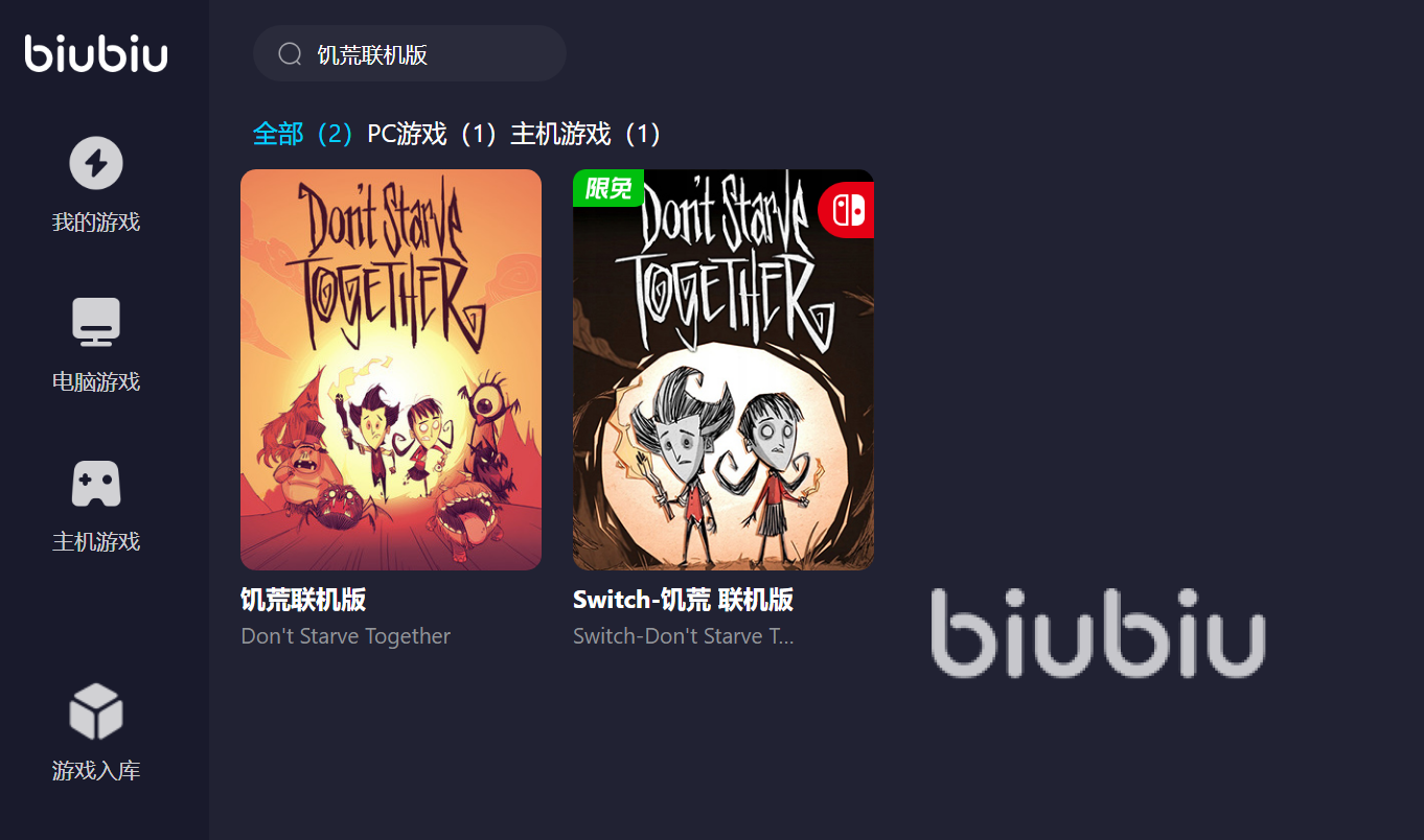 首先,在biubiu加速器上,我們直接進(jìn)行搜索,有兩個(gè)結(jié)果可供我們選擇,大家也可以發(fā)現(xiàn)這個(gè)加速器支持的游戲設(shè)備有兩款,我們都可以選擇。