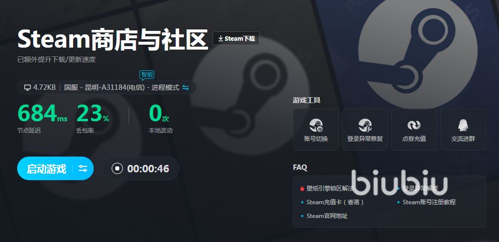 有關steam卡在正在開始下載如何解決就分享這么多了,說得再多都不如大家親自加速一次有說服力,只要點擊上面的按鈕就可以下載最新版本的biubiu了,安裝完畢就能立即使用,它還有非常多的功能等待大家親自探索。