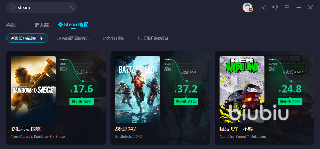steam游戲雖然好玩,但是大部分游戲都是比較昂貴的,大家省吃儉用好不容易才能買一個新游戲?,F在biubiu為大家準備了steam春季促銷,參加春促的都是好玩又實惠的游戲,價格比平時低很多,現在下手是非常劃算的,小伙伴可以逛一逛宣傳頁面,看到喜歡的游戲趕緊下手。
