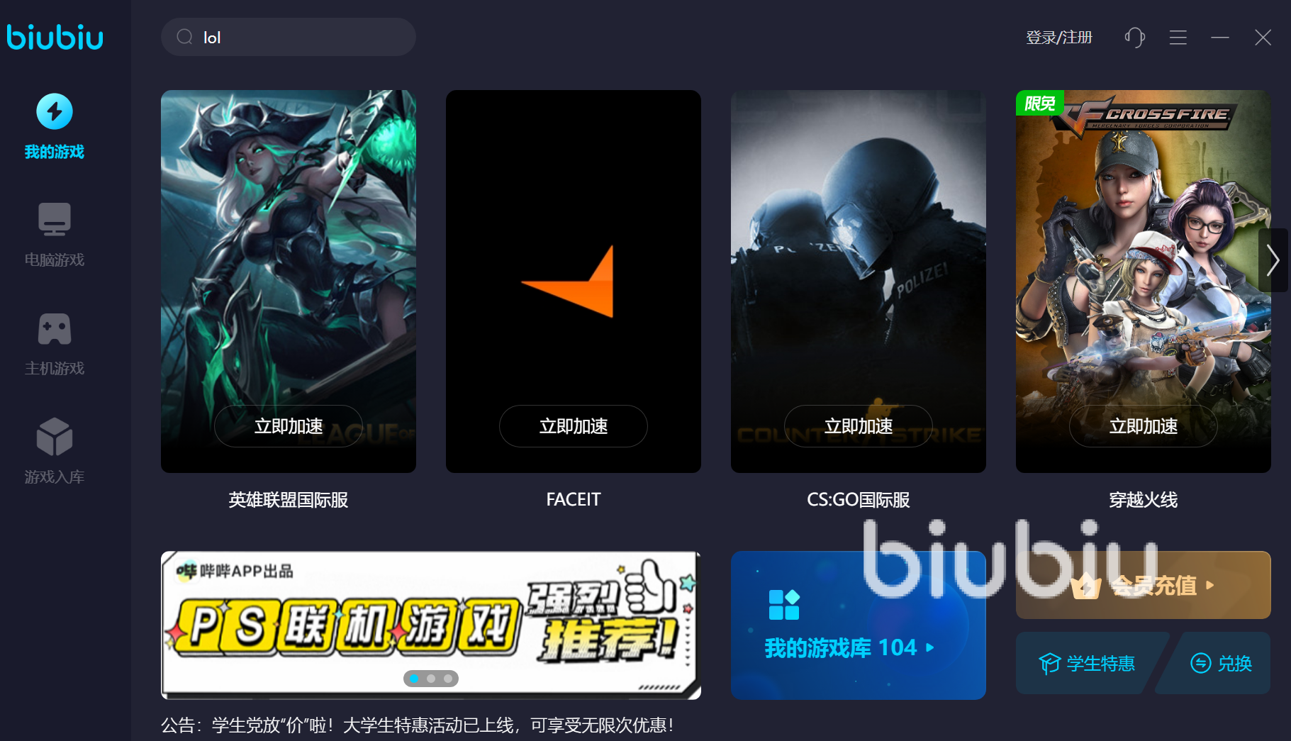 提到了限免大家都應(yīng)該知道后期是需要充值的,但是也不用過于的焦慮費用的問題,平臺為了感謝大家這么多年的支持和認(rèn)可,會不定期的推出各種活動,比如充值有折扣,還有很多限免的國服游戲,如果大家想感受下其他游戲的話,可以抓緊時間嘗試下,畢竟是限時的,具體什么時間結(jié)束小編也不太好說,趁著這個機(jī)會大家可以好好體驗下biubiu加速器的各項優(yōu)點。