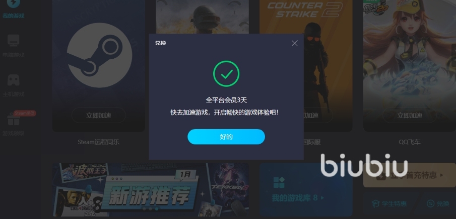現(xiàn)在更是有活動大放送,首先是新人可以免費加速24小時的福利,其次就是不論是新老用戶都可以參與的兌換活動,使用【biubiu不卡頓】這個專屬兌換碼就能夠得到額外的3天加速時長了。
