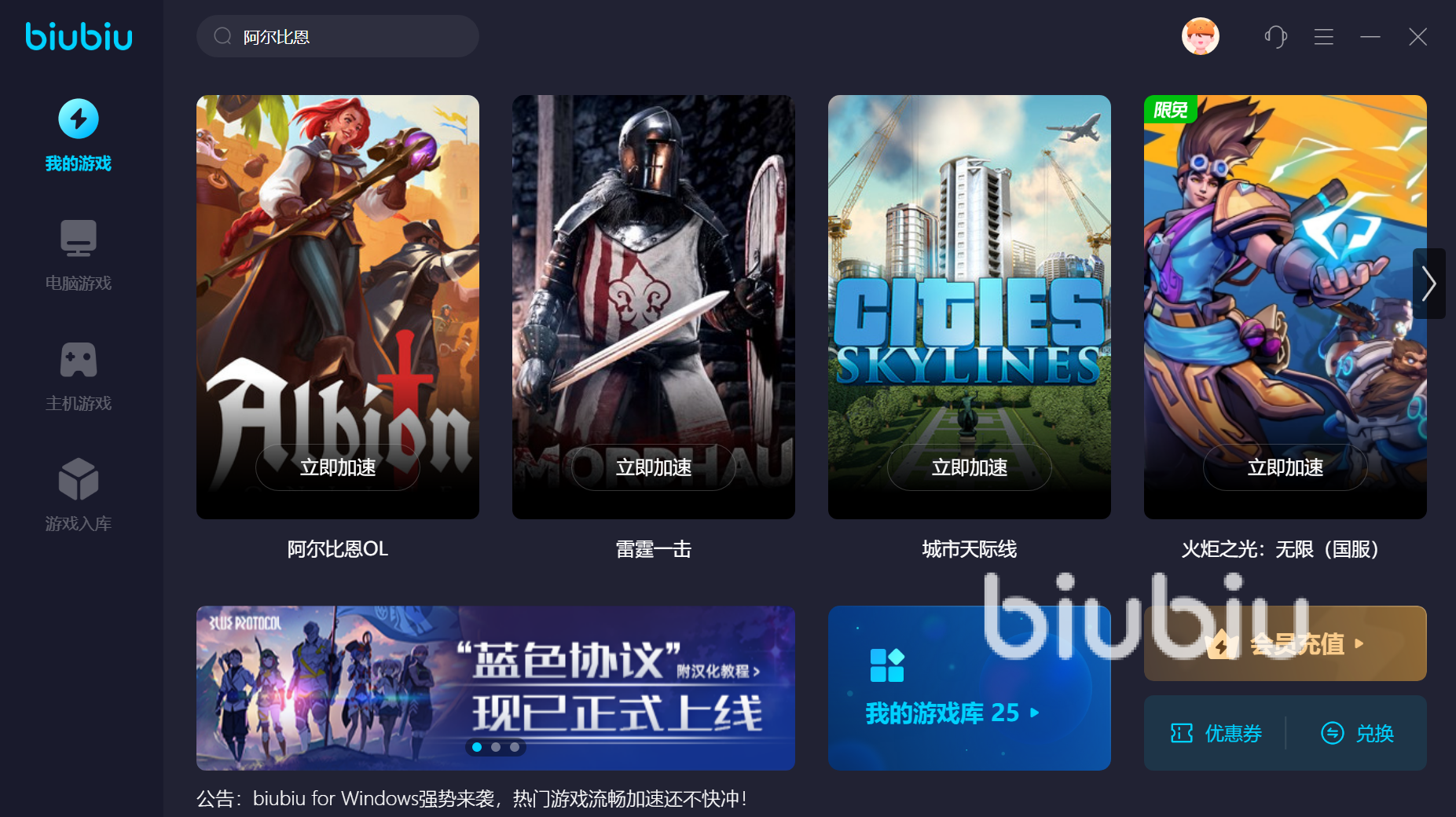 首先新用戶在初次使用是不需要考慮費(fèi)用的問題,平臺會給你24小時免費(fèi)體驗(yàn)的福利,這24小時你可以通過biubiu給任何你想玩的游戲加速,除此之外你下載游戲也可以開啟該加速器,你會明顯的感受到下載速度有很高的提升,然后就是操作方面,沒有過多的繁瑣操作,需要你做的就是將阿爾比恩的游戲名稱編輯到搜索欄目,然后找到對應(yīng)的版本啟動加速就可以一了,其他的節(jié)點(diǎn)選擇,各種線路的搭配都是不需要你操心的。