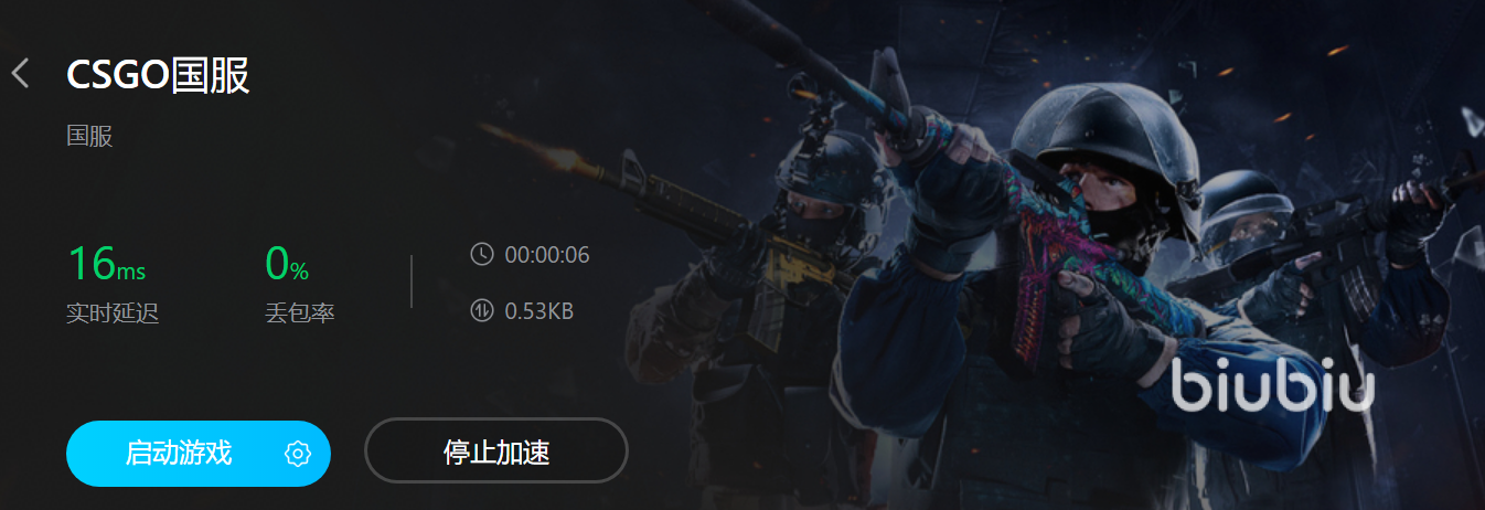 下載安裝biubiu之后通過查找可以看到CSGO的國服版本是支持免費加速器的,而且biubiu的智能加速功能可以根據(jù)實時網(wǎng)絡(luò)狀況,自動調(diào)整加速策略,提供最優(yōu)的游戲加速效果。這意味著玩家無需手動調(diào)整設(shè)置,即可享受到最佳的游戲性能。如果想動態(tài)觀察加速器的效果,在開啟加速之后就有很直觀的頁面展示給玩家。