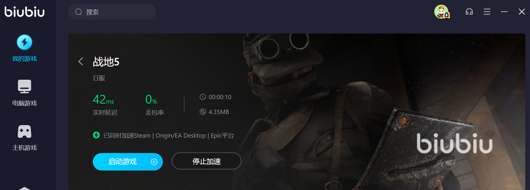 來(lái)源: 極光 作者: 海綿寶寶 2023年04月14日 22:35想必很多的玩家都曾幻想過(guò)在戰(zhàn)場(chǎng)上進(jìn)行一場(chǎng)刺激的戰(zhàn)斗,但是在現(xiàn)實(shí)中卻很難實(shí)現(xiàn)這種愿望,但是在游戲內(nèi)就不一樣了,玩家不僅可以在站場(chǎng)上選擇不同兵種去進(jìn)行戰(zhàn)斗還k,但是有些玩家發(fā)現(xiàn)在游玩戰(zhàn)地5突然卡住然后閃退是什么原因呢,想必有些玩家不知道因?yàn)閼?zhàn)地5游戲采用了寒霜引擎,把游戲內(nèi)的動(dòng)畫(huà)環(huán)境的破壞、包括光照、地圖和音效提升到一個(gè)新的高度,所以對(duì)網(wǎng)速的要求比較高,需要在加速器的幫助下才可以順利的體驗(yàn),所以小編今天給大家推薦一款名為biubiu的加速器給大家,操作簡(jiǎn)潔,實(shí)用性也是很強(qiáng)的哦。