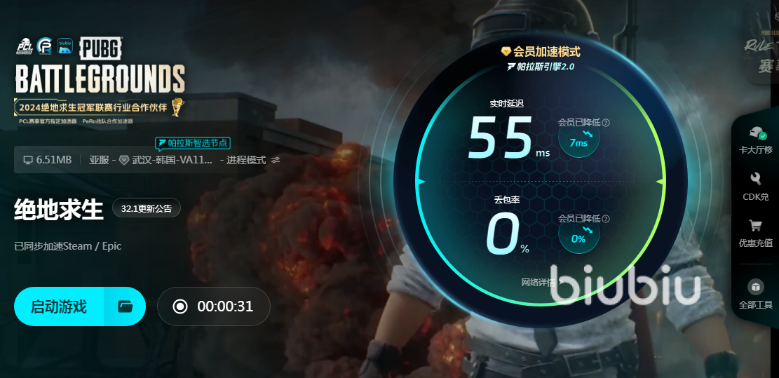 相信小伙伴們都知道絕地求生閃退怎么辦了吧,只要有biubiu在,你們就能享受到非一般的網(wǎng)速,在毫秒之內(nèi)的延遲幾乎感受不到,游戲過程中的地圖切換十分絲滑,跑動和操作起來也很流暢,隊(duì)內(nèi)溝通再也沒有卡頓阻礙,一起來享受歡樂的游戲時光吧。