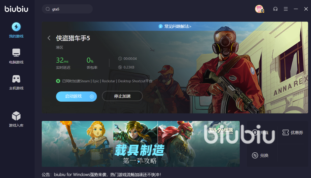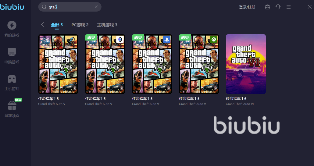 在主界面的搜索欄直接編輯gta5游戲就會直接跳轉(zhuǎn)出加速選項的界面,這里其他平臺的版本是提供了限免加速活動的,如果正好是對應(yīng)小伙伴玩的版本,那就可以免費的的體驗了。另外小編想要告訴大家的如果是第一次使用biubiu加速器的話,登錄注冊是可以領(lǐng)取24小時的免費加速時長,很多的玩家覺得太短了不夠用怎么辦呢,沒關(guān)系,直接帶著小編給大家準(zhǔn)備的“biubiu不卡頓”的口令還能在這個基礎(chǔ)上得到三天的免費加速獎勵,兌換的時候一定要注意字母的大小寫,如果輸入錯誤的話是沒辦法領(lǐng)取的。