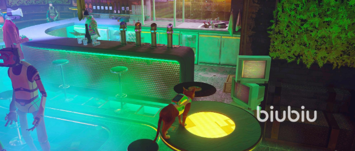 吧臺里有一杯奇怪的飲料,拿走可以得到欄桿。酒保會告訴你,大金鏈子哥已經(jīng)把 VIP包間給包了。調(diào)酒師身后有一條暗道,可以從這里得到一段記憶。
