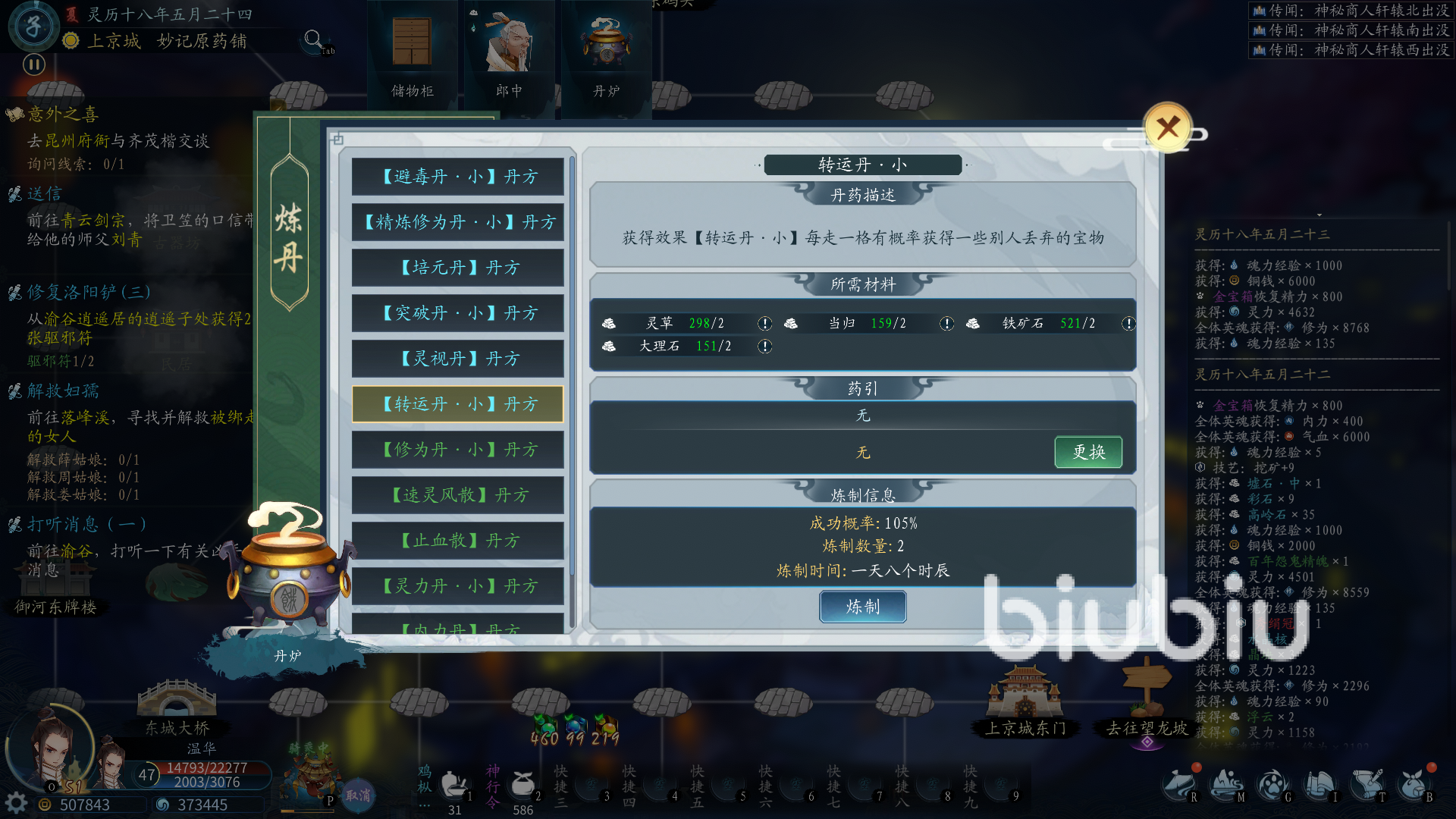 當(dāng)我們背包中這些材料多了之后,我們就直接使用最低級的藥材制作綠色的凝氣丹,綠色的凝氣丹的配方是三個草藥和三個當(dāng)歸,這兩個藥材前期比較好獲取,批量制作即可,而且這個丹藥是整個游戲中唯一可以使英魂復(fù)活的丹藥,凝氣丹捐贈可以獲取三點(diǎn)貢獻(xiàn)值,總共需要一百顆凝氣丹,凝氣丹煉制還是比較快的,只需要五個時辰即可,身上有三個丹爐還能一次煉制9顆,效率還是比較高的,基本五天之內(nèi),就可以貢獻(xiàn)值拉滿了,等到過了之后,百草堂會給予我們一個煉制木靈丹的任務(wù),做完即可。