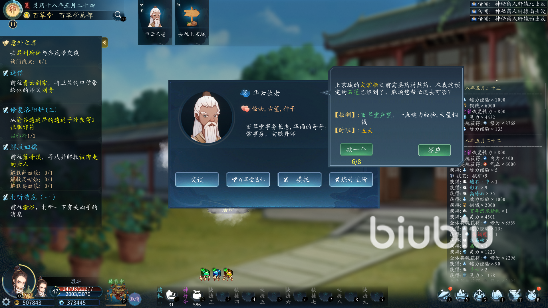 百草堂的聲望有兩種辦法提升,一種是捐丹藥,根據(jù)丹藥的品質(zhì)來決定貢獻(xiàn)獲得的聲望,另一種則是做百草堂的委托任務(wù),這種任務(wù)大部分情況下都比較簡單,一共有三種情況,第一種情況最簡單,去給某某人送藥,基本都是在附近的人;第二種則是煉制某種丹藥,青銅階級給的任務(wù)基本都不會太難,丹藥需要的基本都是綠色或者白色的,比較好練。