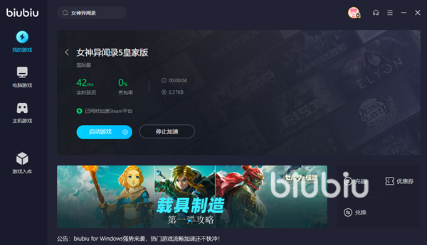 選擇自己正在游玩的版本就可以點擊加速按鈕一鍵開啟網絡優(yōu)化服務了,此時我們會發(fā)現(xiàn)游戲的延遲得到很大程度的降低,ping值從原來的快小百直接大跌到40左右。這個時候運行啟動游戲,會發(fā)現(xiàn)驗證的速度加快,游戲能夠正常運行。因為biubiu同時給steam平臺也提供了一定的修復作用,所以在關閉游戲后的云存檔同步過程中也能夠獲得速度提升,讓我們能夠以更好的狀態(tài)繼續(xù)下一個游戲的冒險旅程。