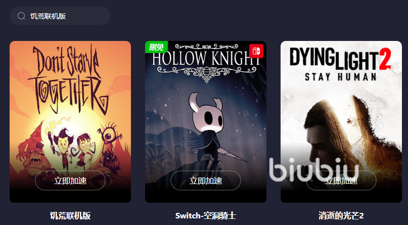 同時考慮到這是一款聯(lián)機的游戲,服務器還是海外,所以很多加速器是滿足不了的,biubiu加速器針對游戲的加速提供了自動切換節(jié)點的功能,并且還有著全球下載一鍵建立專線鏈接的服務,幫助用戶穩(wěn)定游戲的運行很有一套,效果上也是非常的顯著,使用也方便的很,小伙伴們直接去首頁搜索饑荒聯(lián)機版就會看到對應的專欄,在點擊開啟加速就可以了。