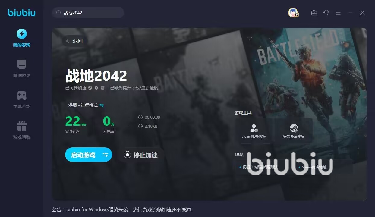 為什么這么多加速器這里推薦它呢?首先是安裝包的體量小,雖然現(xiàn)在硬盤動(dòng)不動(dòng)就是1TB起步,但對(duì)于玩家來(lái)說(shuō)能省則省,光《戰(zhàn)地2042》就占了150G,biubiu作為加速工具,更輕巧的體量不會(huì)占用太多的存儲(chǔ)空間。另外下載安裝也會(huì)很快,讓你輕輕松松就能享受到更快的網(wǎng)速。