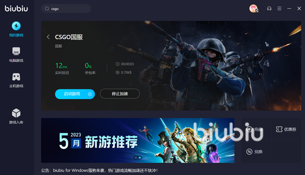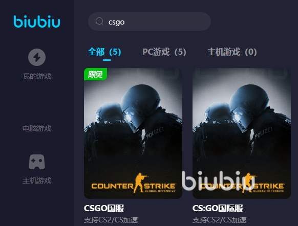 Biubiu的使用方法也同樣十分簡單,進入軟件之后直接搜索游戲名稱就可以看到相關(guān)的游戲加速服務(wù)項目。像csgo這款游戲,大家是可以選擇國服或者是國際服版本的,好消息是目前國服的加速服務(wù)是免費提供給大家的,游戲庫中還有更多免費的國服加速等待大家體驗。