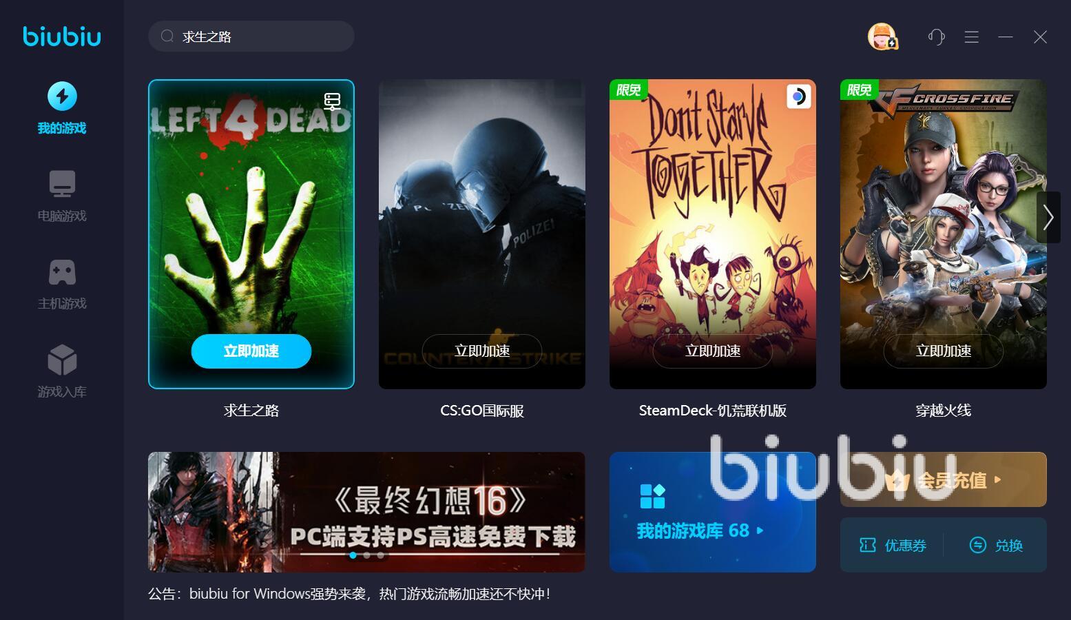 如果不是電腦本身的問題,那么就是網(wǎng)絡(luò)的原因,可能在游戲運行過程中,網(wǎng)絡(luò)波動的太厲害,導(dǎo)致畫面出現(xiàn)了卡頓。仙姑解決也不難,只需啟動biubiu加速器,找到求生之路獨享的加速入口,接著點擊圖標上方的立即加速按鈕,就可以了。如果你是新用戶,注冊之后還能免費使用加速24小時。