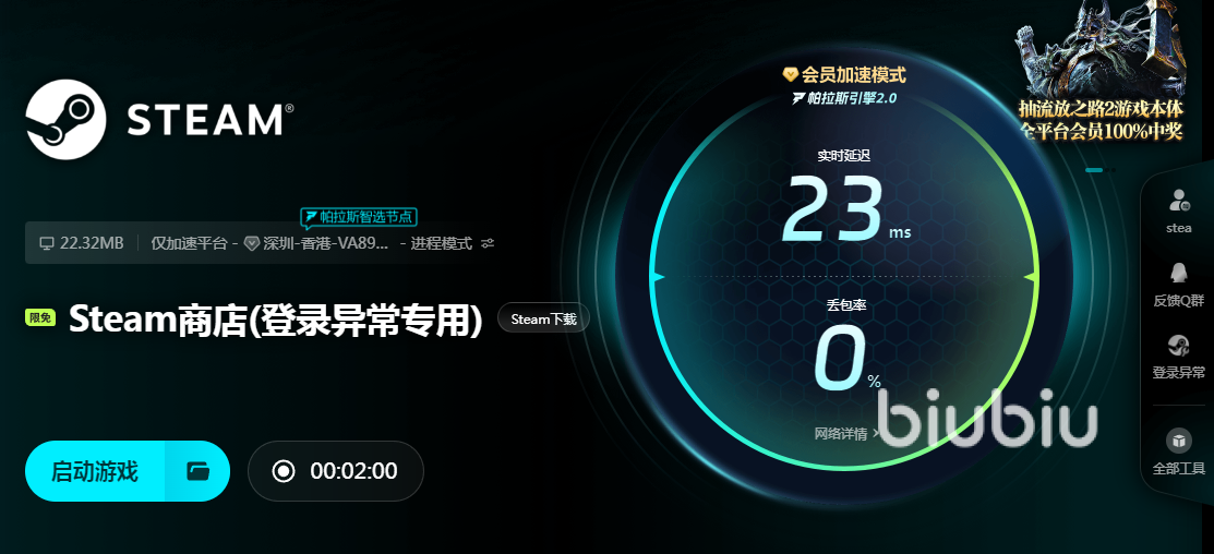 其次就是軟件的加速范圍特別廣,就拿steam來說吧,它不僅可以加速商店和社區(qū),還能用在跨區(qū)入庫、遠程同樂,甚至直接對游戲進行加速。這都得益于平臺強大的資源,它的資源涵蓋全球,從游戲到區(qū)服應有盡有,biu仔也會不斷為大家搜羅好游戲讓大家能夠玩?zhèn)€痛快。