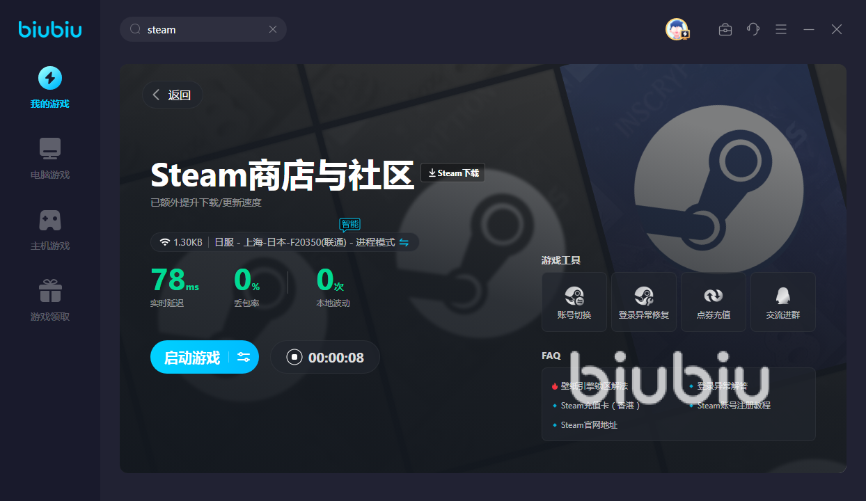 在biubiu中搜索steam名稱之后,就可以看到有很多相關(guān)選項,玩家可以根據(jù)實際需求選擇不同的選項進行加速。例如可以解決登錄失敗和登錄困難等問題,還可以解決商店和社區(qū)瀏覽異常以及下載速度過慢等。尤其是在下載加速過程中,更是彰顯出biubiu的優(yōu)質(zhì)效果,利用自身專線,最多能達到500%加速效果,這對于一些體積非常大的游戲來說非常有必要。很多玩家都遇到過,在下載時候速度慢,而且還會出現(xiàn)中途斷點,現(xiàn)在優(yōu)化以后就能夠有效解決。另外對于一些熱門的鎖區(qū)游戲,也可以在這里選擇相關(guān)選項以后直接解決。下載好游戲之后,同樣能夠直接進行加速,充分利用其現(xiàn)有硬件資源,保證低延時運行,還有一鍵加速以后直接進行跨服登錄的操作。