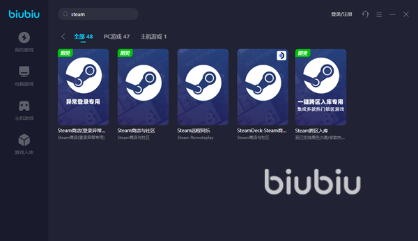目前市面上支持steam網(wǎng)絡(luò)修復(fù)的工具比較少,小編已經(jīng)將biubiu的下載地址貼在上面了,大家點(diǎn)擊鏈接就可以下載使用。打開(kāi)軟件之后如果是新用戶(hù)可以領(lǐng)取到24小時(shí)免費(fèi)試用的特權(quán),全場(chǎng)的熱門(mén)游戲等待大家進(jìn)行網(wǎng)絡(luò)優(yōu)化,但其實(shí)今天我們討論的steam修復(fù)是免費(fèi)的功能。我們直接在軟件中搜索steam,可以看到有很多相關(guān)的服務(wù)。想要解決官網(wǎng)卡頓我們需要選擇商店加速,如果是賬號(hào)登不上去,就選擇登錄異常的那一個(gè)。