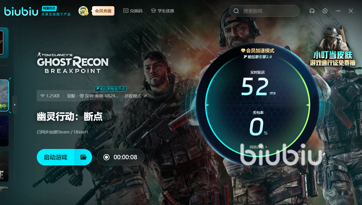 由于幽靈行動斷點屬于海外大作,暫且沒有上線國服。所以想要加入這次行動,我們就得用上biubiu。加速后才能靈活的展開幽靈行動,而不是只能被動的等待別人屠戮。新用戶的話可以領取24小時的免費加速,另外新老用戶鍵入【biubiu不卡頓】,就能額外獲得三天免費加速。如果射擊時過卡,就很容易讓自己射歪,甚至引火燒身。唯有啟動加速器之后,才能提升自己的槍術以及準頭,讓自己具備存活下去的本領。
