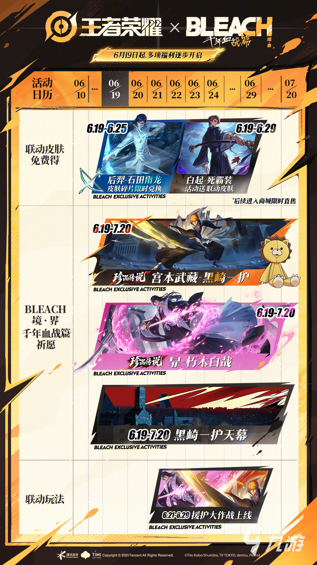 聯(lián)動活動從2025年6月19日正式啟動,更新后玩家就能進(jìn)到入游戲大廳查看“BLEACH”專題頁面,領(lǐng)取登錄禮包、參與祈愿,以及獲取免費(fèi)皮膚或碎片。