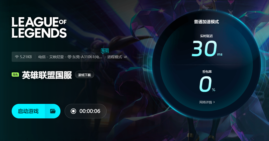 具體的操作也很簡(jiǎn)單,點(diǎn)開這個(gè)加速平臺(tái),輸入英雄聯(lián)盟游戲,選擇適合自己的加速區(qū)間,因?yàn)橛械男』锇橥娴氖菄?,有的則是外服,所以這個(gè)需要區(qū)分一下。加速之后,大家可以看到游戲的加速效果還是比較穩(wěn)定的,各種數(shù)據(jù)狀況良好。