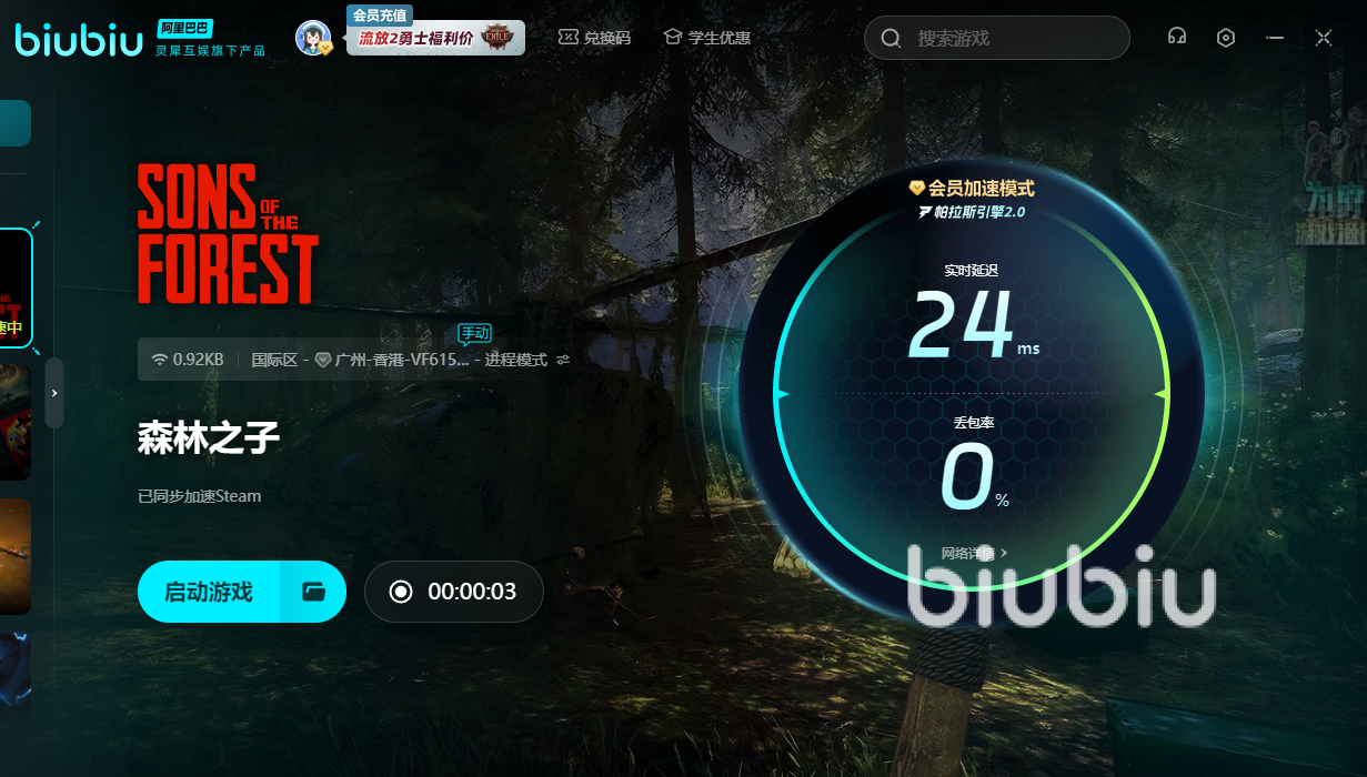 森林之子如今暫時沒有國服,所以為了與全球其他范圍內(nèi)的人在新的島嶼開啟生活。大家就要使用biubiu,才能被飛機派遣至這座島嶼中。新用戶的話可領(lǐng)取3小時的免費加速,此外,新老用戶通過【biubiu不卡頓】,便可額外獲得三天免費加速。不過光是憑著一腔熱血就無法在森林中活下去,還得借助加速器。這樣就能拒絕卡頓,讓你在時間流逝之前就做好各種生存準備,防止自己被邪惡生物給狙殺。