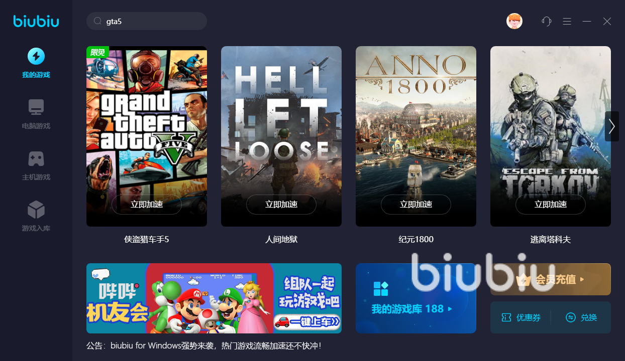小編也是知道大家對(duì)于這款游戲非常喜歡,如果加速器的使用很麻煩的話,那么肯定也是不行的,所以biubiu把界面設(shè)計(jì)的很是簡(jiǎn)潔,主要的功能都是在左側(cè)之中體現(xiàn),玩家可以在里面直接去搜索想要去開啟加速的游戲,然后再去點(diǎn)擊藍(lán)色的立即加速按鈕即可,在這些步驟都完成以后,工具也會(huì)第一時(shí)間為大家去建立對(duì)應(yīng)的加速通道,要知道現(xiàn)在去下載的話,新用戶可是有著72小時(shí)的免費(fèi)試用機(jī)會(huì),同時(shí)國(guó)服的一些游戲也是有著限時(shí)免費(fèi)福利的哦。