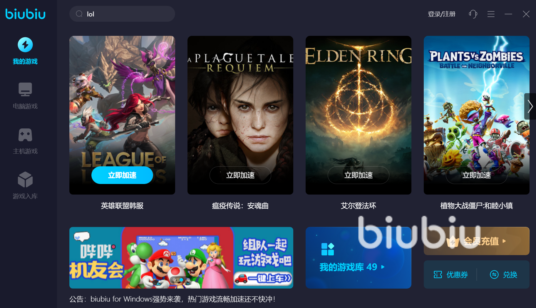 如果玩家是biubiu加速器的新用戶(hù)的話,前24小時(shí)你可以免費(fèi)試用加速器給游戲庫(kù)里邊的任何游戲進(jìn)行加速。不需要領(lǐng)取登錄注冊(cè)就可以享受。軟件的加速效果十分顯著,搭配國(guó)際專(zhuān)業(yè)的路線讓玩家們可以更好的去體驗(yàn)來(lái)自世界各地好玩的游戲。