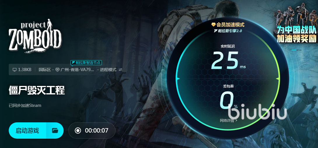 感覺網(wǎng)絡(luò)不給力,趕緊呼叫biubiu來幫忙。在強大的游戲庫里面找到僵尸毀滅工程,立馬就能啟動按鈕加速了,使用方法真的特別簡單。不需要用戶選擇節(jié)點,也沒有多余的步驟,啟動以后系統(tǒng)自己分配節(jié)點運行加速,讓游戲快速連上服務(wù)器,還可以開啟校園鏈式通道,就再也不擔心玩游戲被弱網(wǎng)影響了。