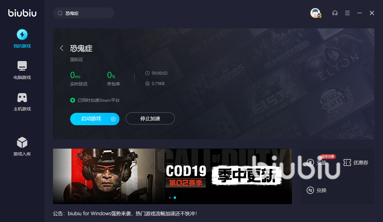 所以使用biubiu加速器去游玩恐鬼癥是非常有效的。小伙伴們可以通過瀏覽器去搜索biubiu官網(wǎng)就能夠下載,或者點(diǎn)擊上文附帶的鏈接也能夠快速下載體驗(yàn),如果小伙伴們是新用戶的話,只需要在注冊(cè)后完成實(shí)名認(rèn)證就能夠免費(fèi)獲得24小時(shí)的全平臺(tái)會(huì)員體驗(yàn),不僅有恐鬼癥的加速,還有數(shù)百款各種游戲的加速方式,如果有熱愛游戲的小伙伴,絕對(duì)能夠輕松滿足需求。