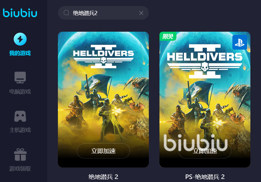 小編建議大家體驗這個游戲用biubiu加速器,幫助你們流暢體驗,界面也比較簡潔易用,讓各位用戶都能輕松使用。可以直接通過搜索引擎找到你想加速的游戲,就比如本期文章提到的絕地潛兵2你就可以直接搜索,然后需要大家來選擇區(qū)服了,國際服、港服、日服、美服、澳服等等都應(yīng)有盡有,選擇你體驗的對應(yīng)區(qū)服點擊就可以進行加速了。像大家經(jīng)常體驗和搜索的游戲就會直接放到我的游戲欄目內(nèi),方便你的下一次加速與尋找。