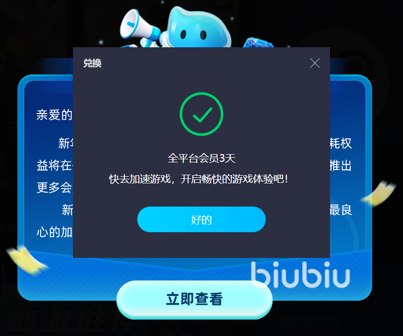 現(xiàn)在的話新用戶只要登biubiu加速器都可以獲得平臺免費發(fā)放的24小時網(wǎng)絡加速體驗時長。并且在使用中如果能夠通過學信網(wǎng)的學生身份信息認證的話,后續(xù)的活動或服務都可以享受學生優(yōu)惠。同時大家也可以使用小編提供給大家的兌換碼在活動頁兌換三天的全平臺會員,目前的活動最新兌換碼為【biubiu不卡頓】,不過活動每個賬號只能參與一次。