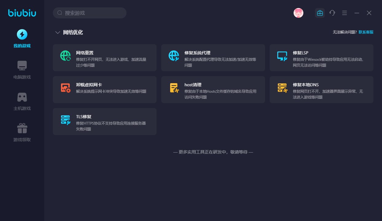如果是因為網(wǎng)絡問題引起的閃退,還可以利用biubiu軟件中自帶“百寶箱”中的網(wǎng)絡修復工具來解決,每個都可以嘗試下,可以解決很多常見問題。這個工具箱的功能還在不斷擴充中呢!相信后續(xù)會有更多實用的功能加入其中。