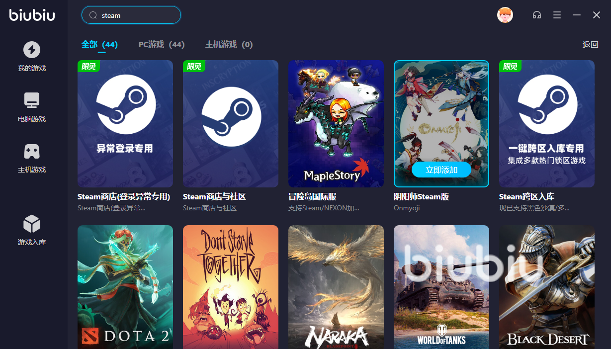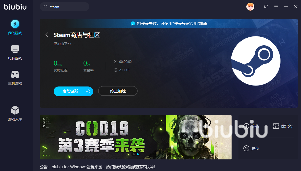 當(dāng)你下載安裝了pc版的biubiu加速器之后,直接登錄就能夠在游戲庫種看到steam的商店以及對應(yīng)的社區(qū),直接在steam商店里邊就可以進(jìn)行加速,或者是在stema商店里邊下載其他的游戲,另外biubiu加速器還為大家提供了steam商店異常登陸的專用加速器功能選項(xiàng),如果你在登陸中遇見了問題直接點(diǎn)擊它就可以快速的解決了。