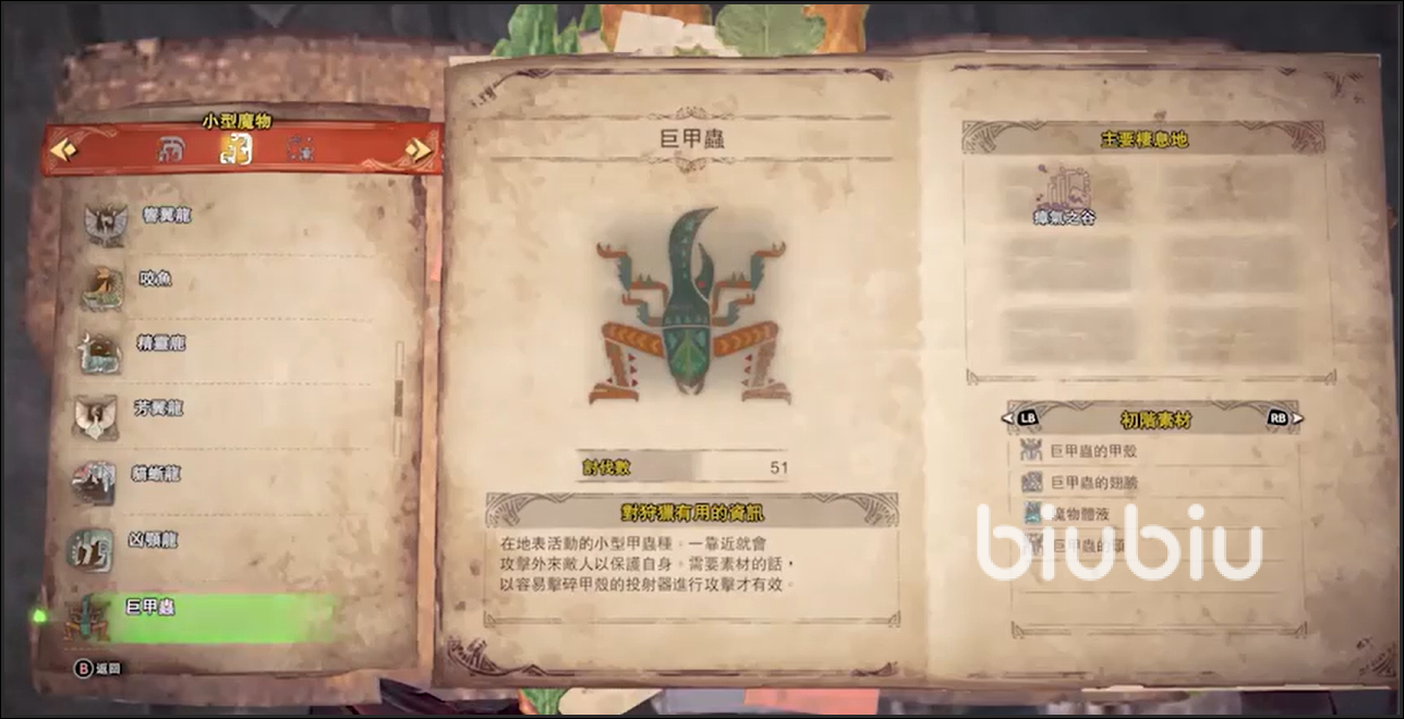 下位怪物還是比較容易進(jìn)行狩獵的,我們可以選擇赤甲獸、飛蜘蛛、臣蜘蛛等好殺的怪物。幾乎所有的蟲子類怪物都是很好掉落怪物特濃體液的。