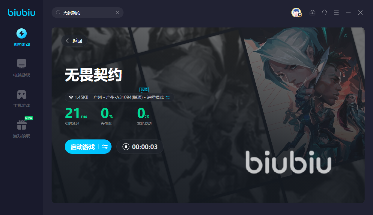 當(dāng)大家身處無畏契約的競技場里時(shí),其實(shí)每一分每一秒都有可能被出現(xiàn)的敵人秒殺,若是卡住的話,則無法招架對手。這時(shí)可使用biubiu,便可獲得高速網(wǎng)絡(luò),從而更好預(yù)知敵人的動向并做出反應(yīng)。該游戲現(xiàn)在加速限免,但若是寶子們打算玩國際服的話亦可。畢竟新人可領(lǐng)取24H的免費(fèi)加速。此外,新老用戶都能使用【biubiu不卡頓】,即可獲得三天免費(fèi)加速,繼續(xù)在這光怪陸離的召喚師平臺里開啟你的競技之旅。當(dāng)然若是想玩其他游戲的話也能辦到,畢竟biubiu可加速的游戲相當(dāng)多,讓大家可隨心嗨玩不同游戲!